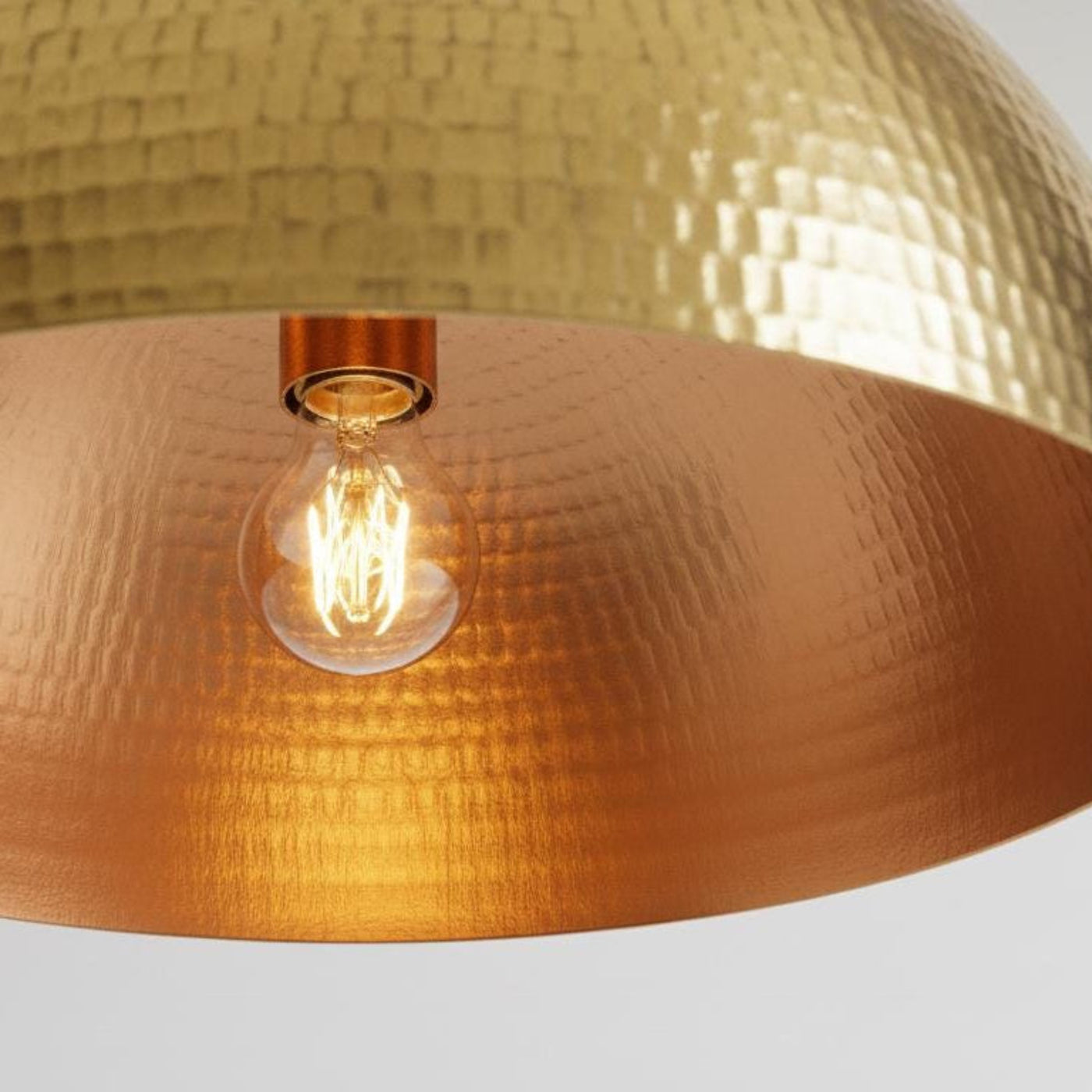 This solid brass dome pendant showcases traditional hand-hammering techniques passed down through generations. The textured hammered surface catches and reflects light beautifully, creating dancing shadows and golden reflections throughout your space. The rich metallic finish on both exterior and interior delivers a warm, inviting ambiance perfect for modern farmhouse, traditional, bohemian, mid-century modern, or eclectic interiors.