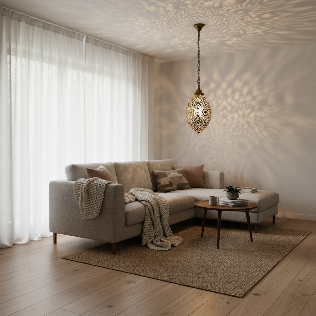This Moroccan hanging lamp fits beautifully in minimalist interiors, bohemian decor spaces, and natural modern homes. It works well as a focal pendant or grouped lighting arrangement.