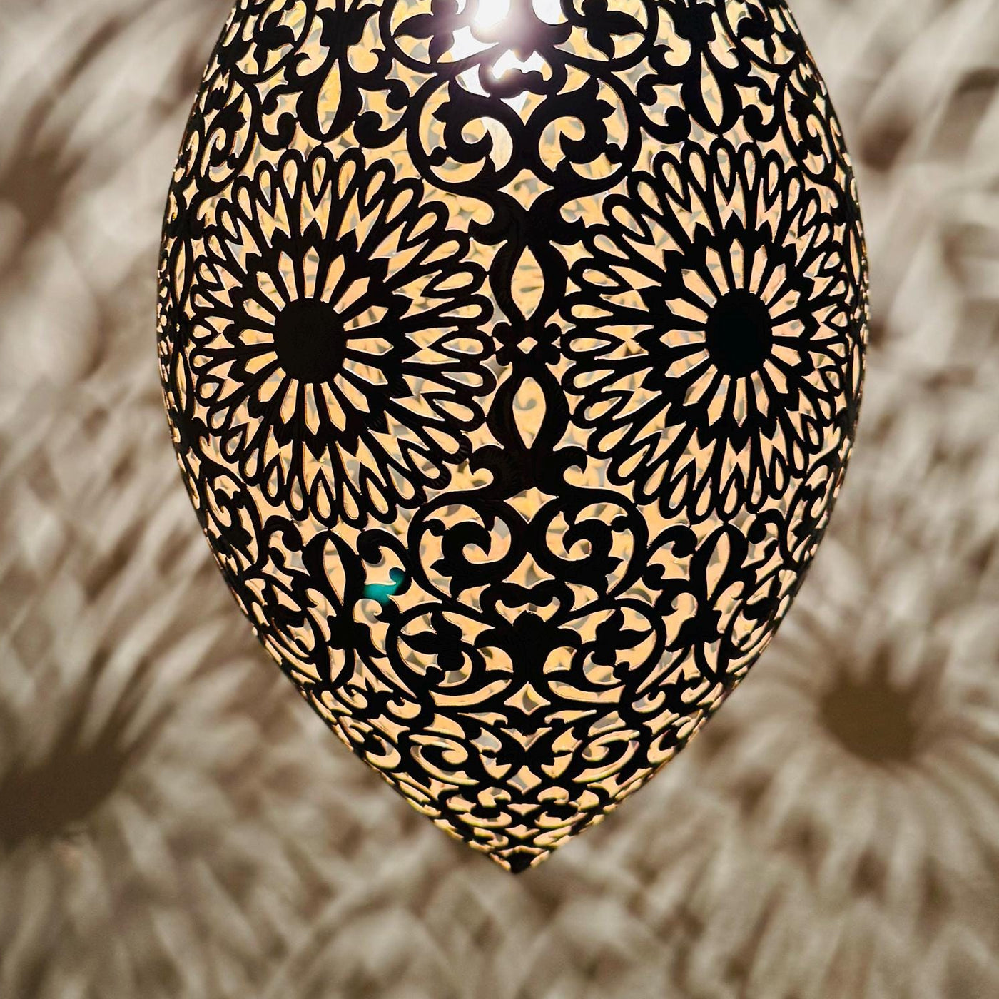 The detailed metalwork creates a soft patterned glow on surrounding walls and ceilings, adding depth and warmth to your space.