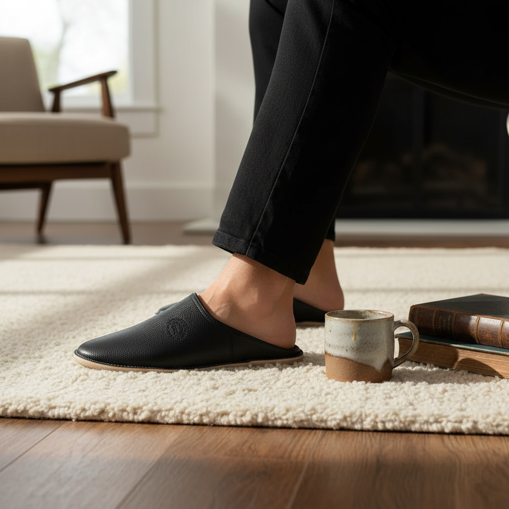 A Modern Classic Redefining the traditional Moroccan slipper, our Pebbled Leather Babouche collection offers a sleek, contemporary aesthetic for the modern home. Featuring a refined pebbled texture and a subtle embossed emblem, these slippers are designed for those who appreciate understated luxury.